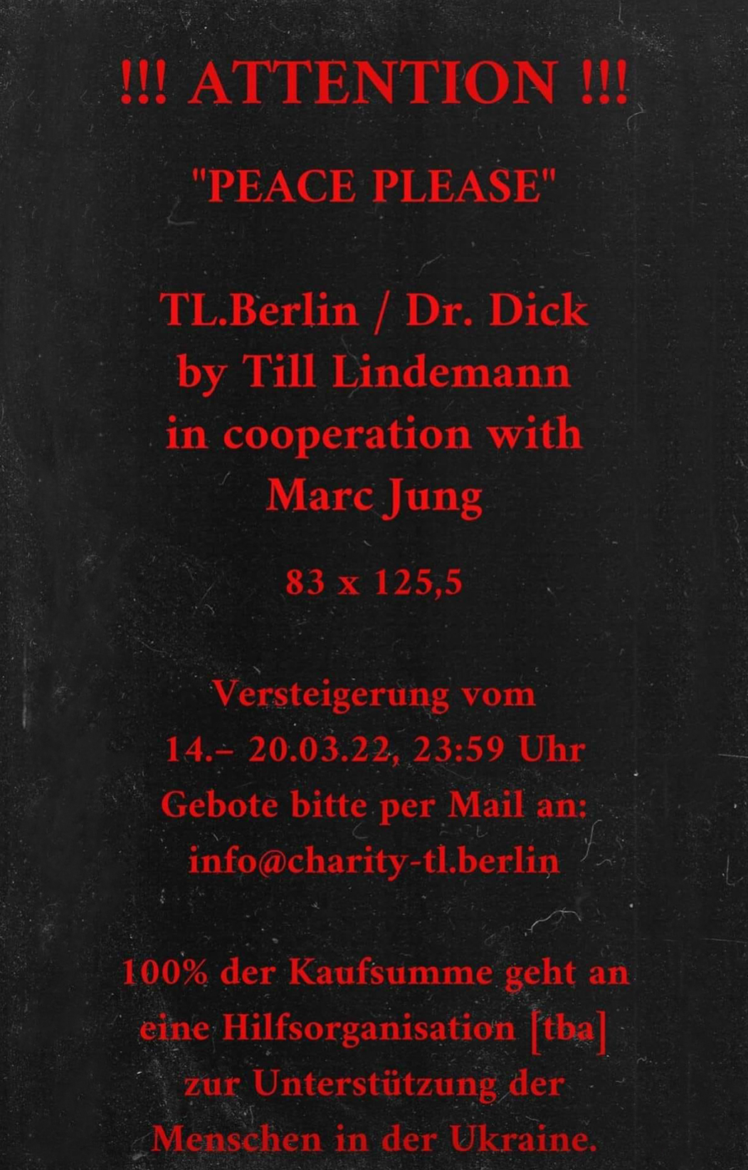 TL Berlin / Dr. Dick by Till Lindemann en cooperación con el artista Marc Junksubastan una pintura en apoyo a Ucrania. Los ingresos de la subasta beneficiarán a una organización que apoya a las personas en Ucrania, esto lo anuncio en sus redes sociales el cantante.